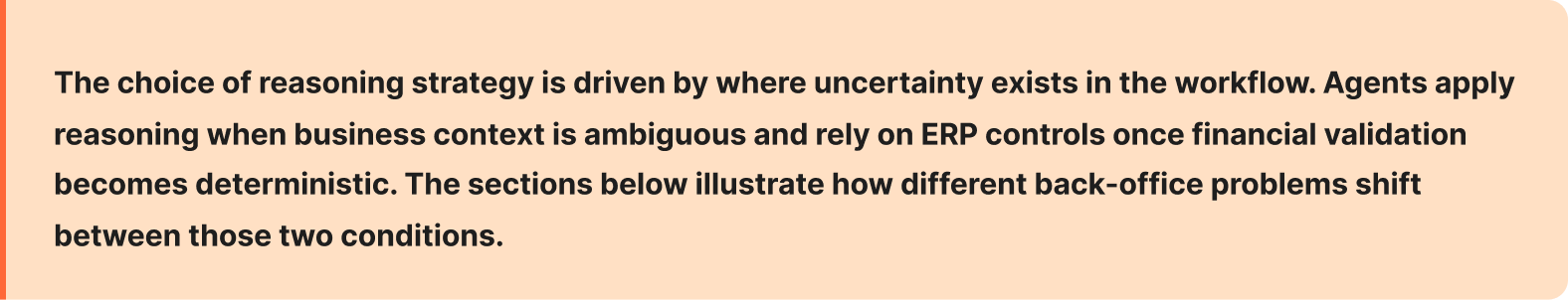 That matters because different back-office problems require fundamentally different reasoning strategies. An agent that monitors your ERP and HCM applications for anomalies needs to think differently than one that matches an invoice to a purchase order, a goods receipt, and a contract. Getting this wrong is why so many enterprise AI deployments underperform.