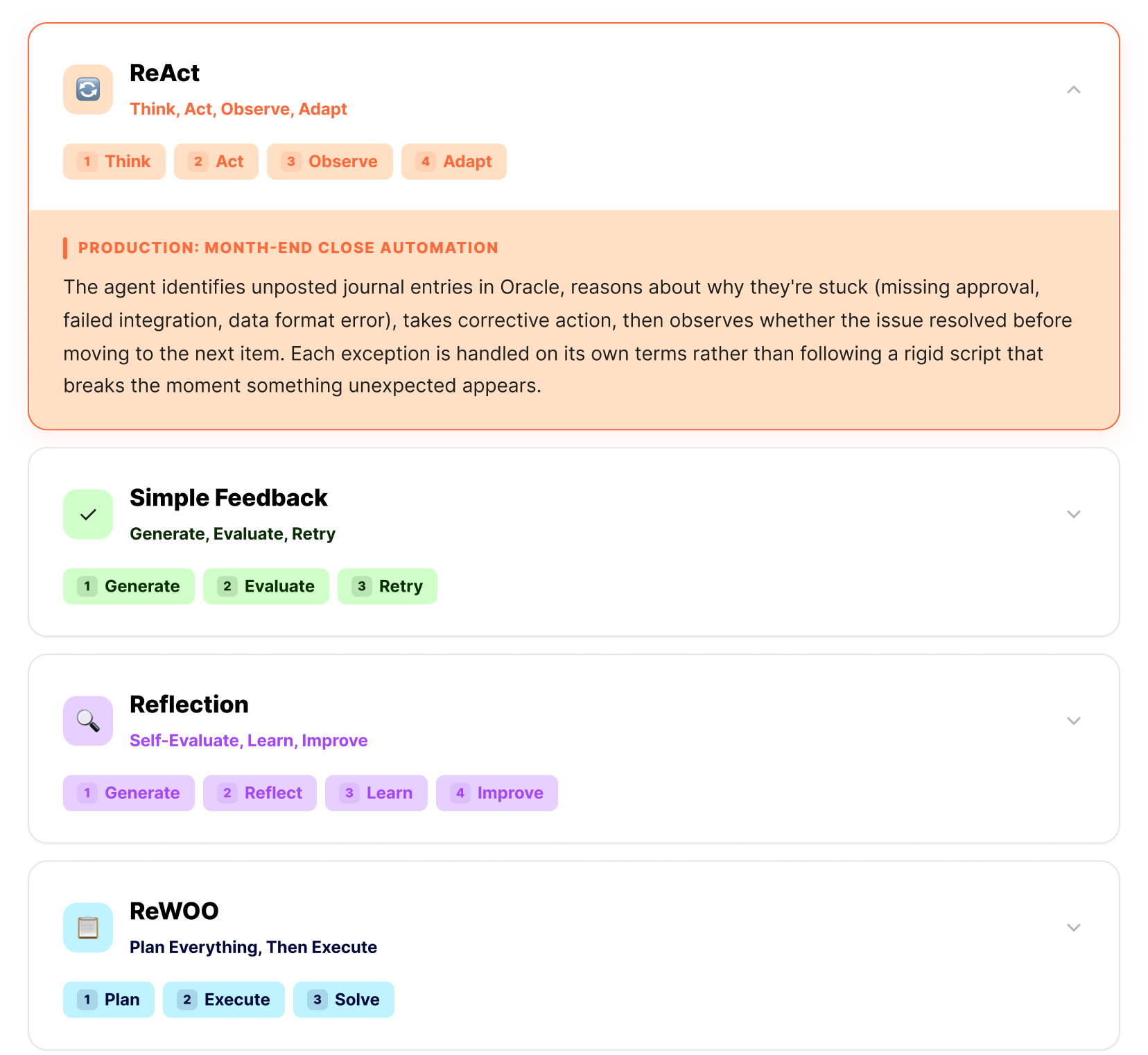 We build agentic AI for Oracle, Workday, and SAP back-office automation and any other system they interact with across your corporate ecosystem. Here are the four reasoning strategies we use in production and how each one maps to the work our agents actually do.
